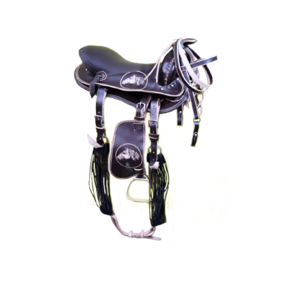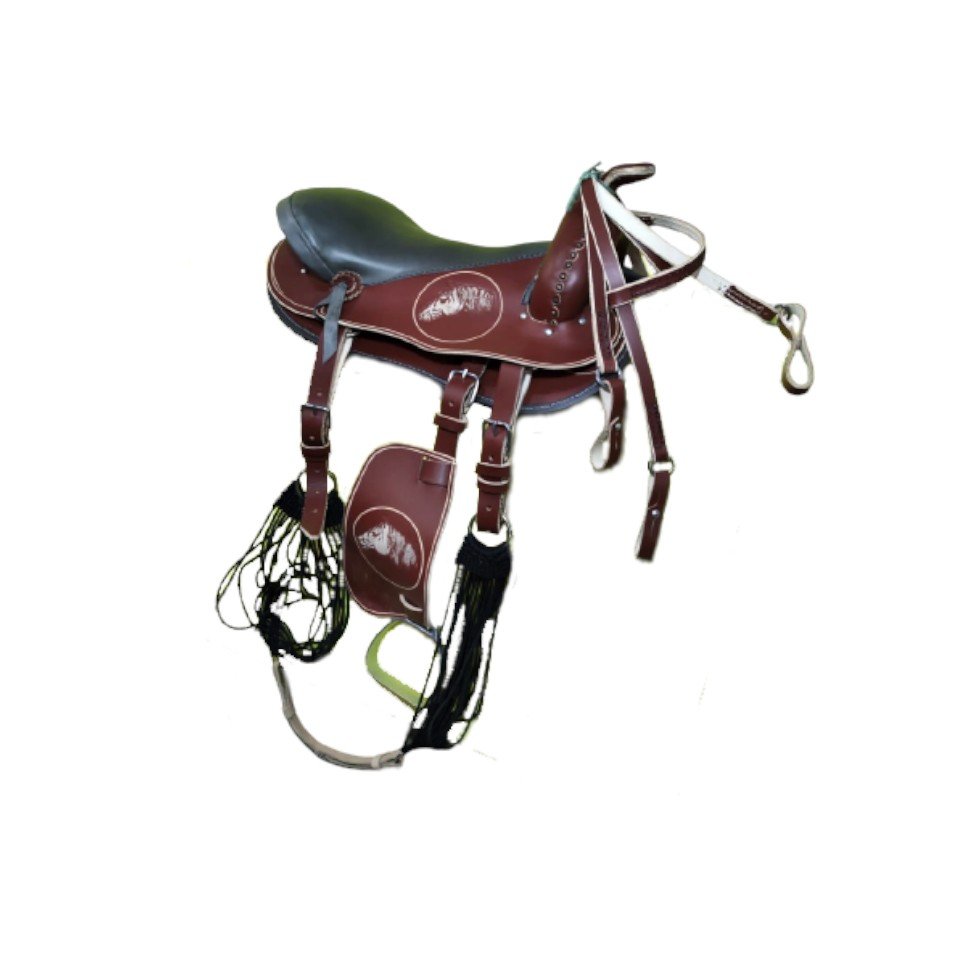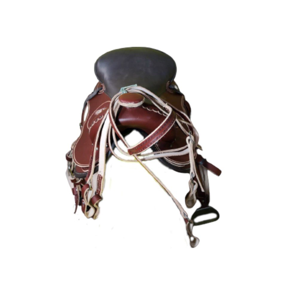Acompanha rédea, barrigueiras,látegos, cabeçada, e estribos com loro